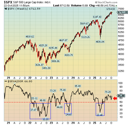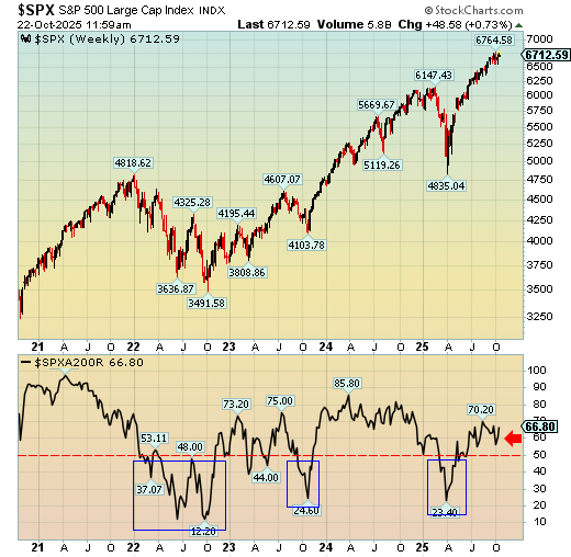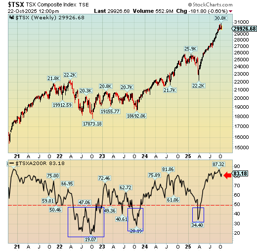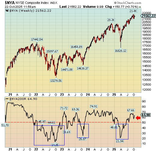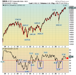 October 22, 2025: A Simple Indictor of Market Strength and DirectionMost market indicators, whether they are economically, fundamentally or technically based, all have one weakness. They are usually subject to the investor's opinion. For example, in economics, the Purchasing Manager's Index (PMI) and unemployment rate are two key tools that are used by economists and market strategists. There is an ocean of indicators that are used in fundamental analysis. The most popular are around growth, earnings and market value. The top indicators are earnings per share (EPS), price to earnings (P/E), and return on equity (ROE). These two classes of analytics provide valuable information about consumers and companies, and by extension, the stock market. However, these methods cannot pinpoint market weakness or strength. They do, however, provide a background for investor concern or optimism. In the third method of analysis, which is technicals, analytical methods can be very subjective. Similar to the first two classes of analysis, the tools and applications can be misleading and incomplete. A simple indicator of market strength can be determined by monitoring the percentage of rising holdings versus the percentage of declining holdings. In Chart 1 of the NYSE, the majority of the holdings are advancing. Currently, 64.76% are rising and only 35.24% are declining. Basically, 2/3rds are rising. The bulls are in control. In Chart 2 of the S&P 500, there is similar strength. 66.60% are advancing. The TSX is the leader in performance, with 82.71% rising and only 17.29% dropping (Chart 3). This high percentage is very bullish. Bottom line: When there is a prolonged percentage of over 60% majority advancing, the market does not decline. When there is less than 40% rising, which means the majority (60%+) are declining, the markets pull back (ie boxed areas). And when the percentage of advancing and declining is nearly equal, markets tend to trade flat. We suggest investors use this simple indicator of the percentage of advancing versus declining stocks to determine market strength and direction. |